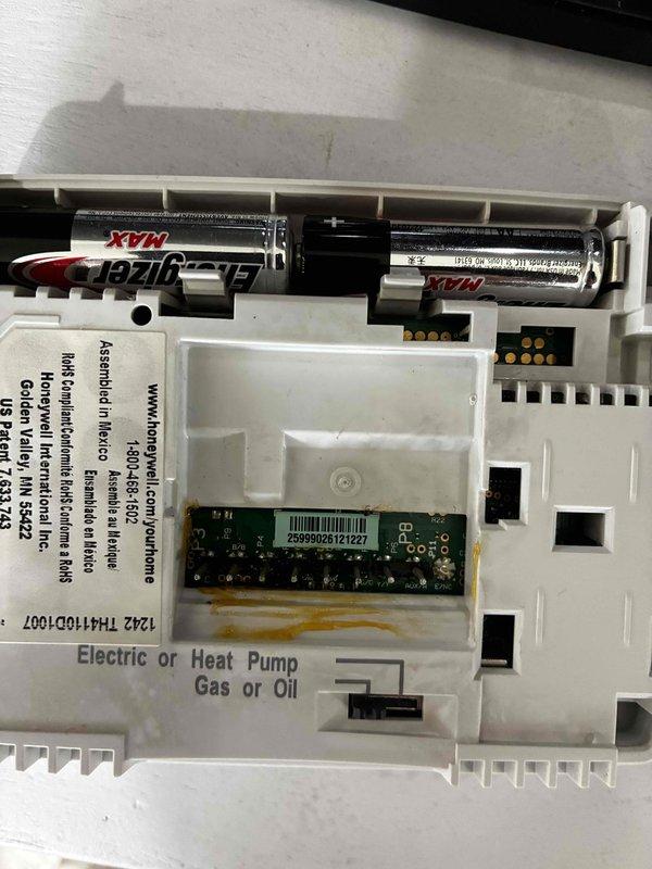 Responded to no cooling complaint on residential HVAC system. Upon inspection, found existing Honeywell thermostat had failed with internal component leaking grease onto circuit board. Removed defective thermostat and installed new Ecobee smart thermostat as replacement. Configured new unit and paired device to homeowner's smartphone for remote access and control. System restored to normal cooling operation.