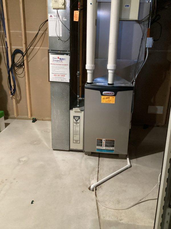 Successfully installed Lennox SLP99 135K BTU high-efficiency furnace in crawl space with new zoning system and wireless thermostats. Reused existing media filter and return, while replacing the cellular core PVC back venting (3" diameter, 22 ft). System was fully tested and verified operational with proper electrical connections completed by on-site electrician.