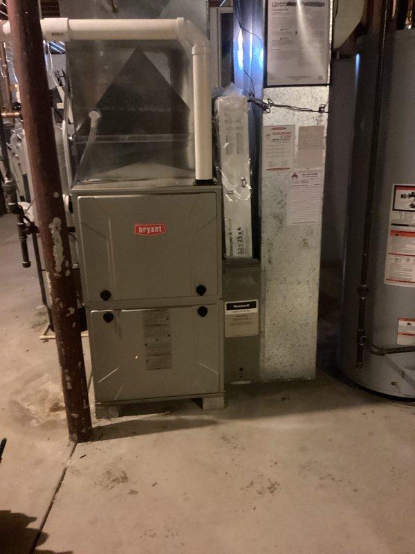 Successfully completed full system installation including EL297V 70K furnace, EL15KC1 2.5 ton condenser, and 30B-71 cased coil with T6 thermostat. Rotated furnace 180 degrees from previous position, installed new 20-foot lineset, added media cabinet, and implemented new PVC venting system for upgraded efficiency (80% to 90%). Coordinated with electrical contractor for general electrical work and modifications required by furnace repositioning.
