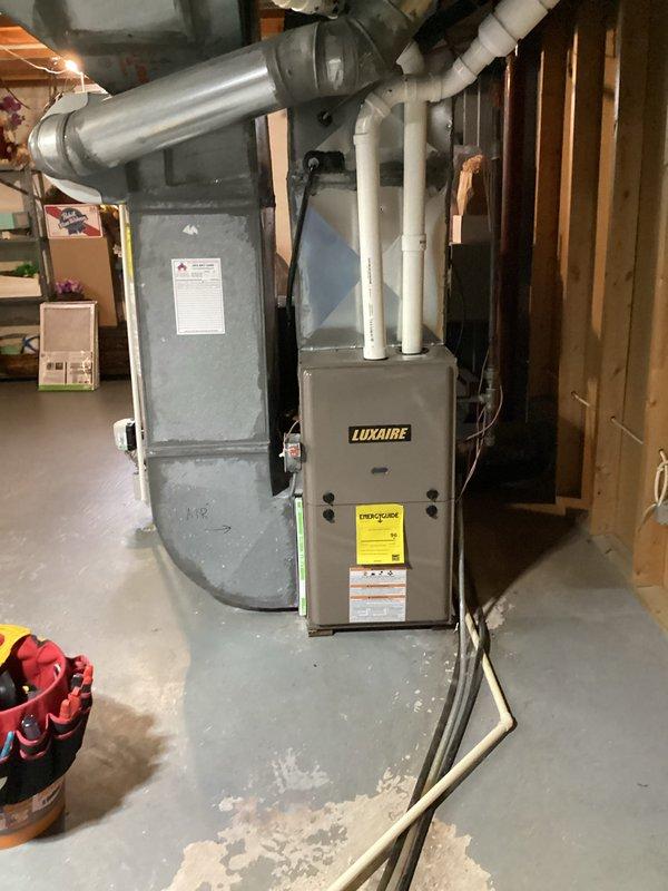 Completed installation of new 80-90% efficiency furnace with EL15KC1 2.5 Ton coil and S40 thermostat. Installed new 25ft PVC venting through rear wall, reused existing media filter cabinet, drop, condensate pump, line set, and humidifier. Integrated humidifier control through S40 thermostat instead of incorrectly positioned humidistat.
