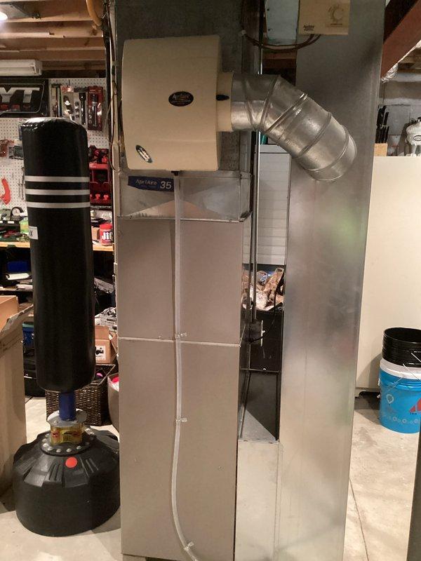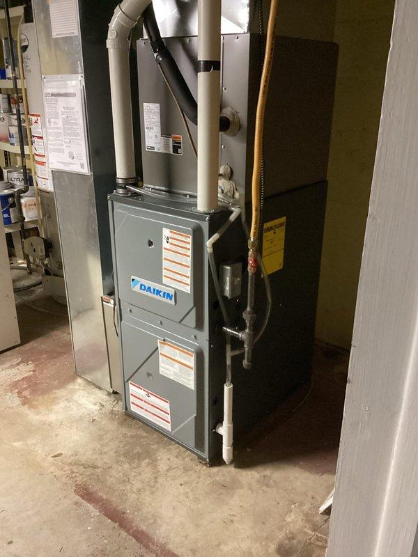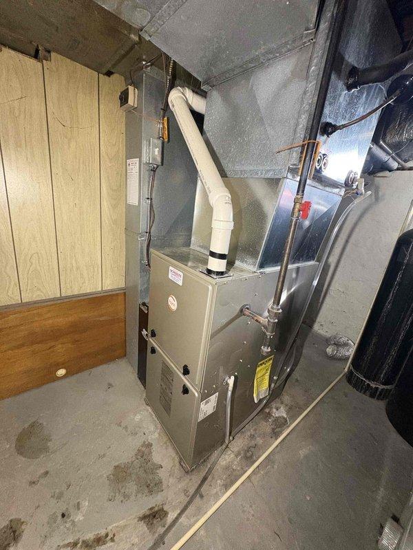 Successfully installed SLP99 90K Furnace with S40 Stat and AA 700 air cleaner in basement utility area. Reused existing 2" solid core venting and return drop with media cabinet, connected condensate drain to sump pump with required neutralizer, and replaced 1/2" gas valve with ball valve. Repositioned 10" round ductwork to accommodate new power humidifier installation on plenum.